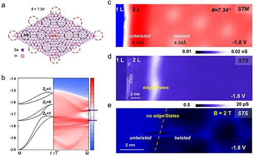 实验上,研究团队在超高真空条件下生长出扭转角为7.34°的双层InSe,并在莫尔畴界处利用STS成像清晰观测到边缘电子态,且其空间分布呈指数衰减,表明该边缘态态局域于莫尔畴边界,且其能量位置与理论完全吻合。进一步施加外加磁场发现该边缘态会消失,证实其受时间反演对称性保护,具有拓扑本征特征。