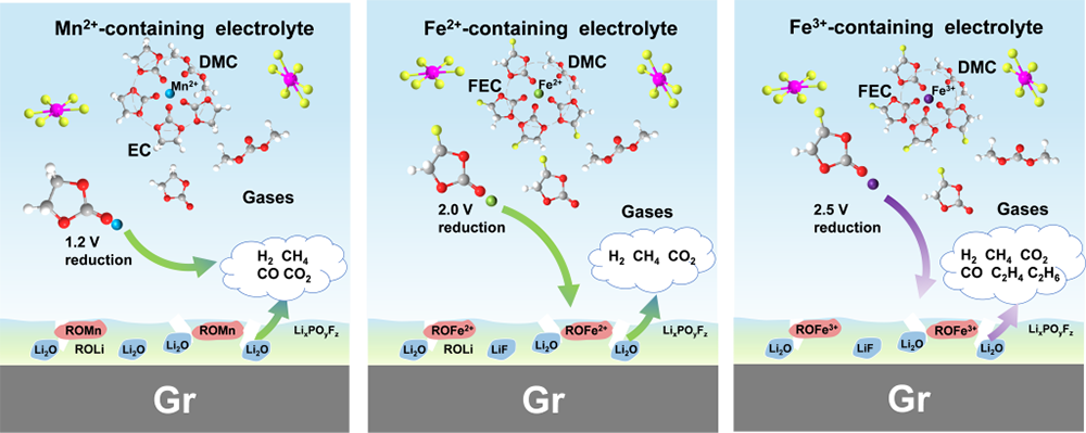 中国科学院物理研究所/北京凝聚态物理国家研究中心王雪锋特聘研究员采用冷冻电镜技术,研究了过渡金属离子Fe(来自LiFePO4正极)和Mn(来自含Mn氧化物正极)的串扰效应,发现了一些共性问题。首先,过渡金属离子(例如Fe3+、Fe2+和Mn2+)进入电解液中优先与电解液中的溶剂配位形成类似“溶剂-TM”,不仅提高了电解液还原电位(更容易被还原),还会催化电解液发生双电子还原反应,使过渡金属离子以有机络合物(如有机Fe、有机Mn)的形式沉积在SEI膜中。其次,过渡金属离子对电解液分解具有催化作用,不仅导致发生更多的副反应和额外气体(如CO、C2H4、CO2等)释放,而且会破坏SEI膜的完整性,导致电解液不断渗透至负极表面被分解。因此,在循环过程中,持续的界面副反应消耗活性Li离子,导致SEI膜呈现出"自下而上"的生长,不断增厚引起电池极化增加。此外,研究还证实,过渡金属离子的价态越高,对电解液的催化作用越显著,产气越多,SEI膜增长速度越快,电池性能衰减也越快。