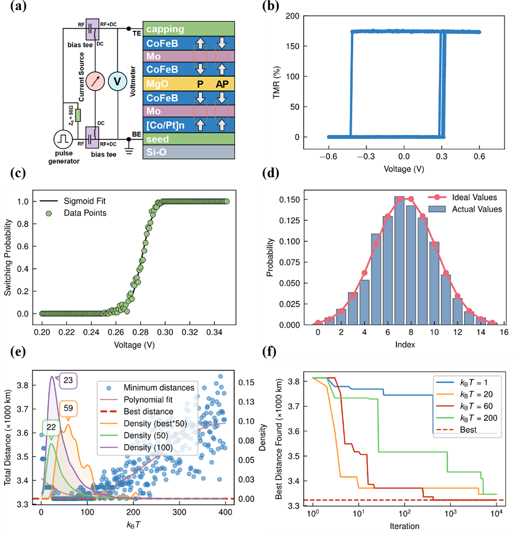图:基于磁性隧道结的概率分布可调真随机数发生器及概率贪心算法求解器示意图。(a) 器件结构与测量系统的示意图。(b) 由脉冲电流触发自由层磁矩翻转所表现出的磁性隧道结隧穿磁电阻(TMR)高低变化行为。(c) 磁性隧道结的磁矩翻转概率随写入电压变化的关系曲线,黑色实线为拟合得到的S形函数。(d) 由磁性隧道结真随机数发生器生成并呈现高斯分布的随机数。(e) 不同温度kBT取值(1至400)下获得的最优解散点图(左)以及在最优解附近0、50和100千米内的解空间密度分布图(右)。每个密度图基于概率贪心算法的100次独立求解结果。(f) 在四组kBT取值下最优路径长度随迭代次数的变化关系。当kBT = 60时可在约1000次迭代内获得最优解。