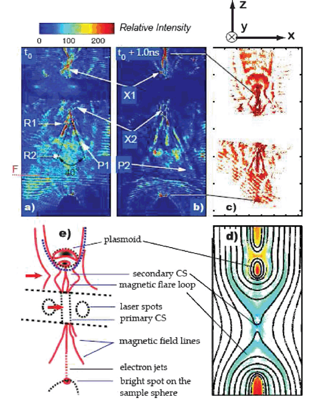 | 图一:利用干涉方法得到测得的磁重联结构。图a和b对应两个不同时刻。电子耗散区在X1和X2之间。图c为等离子体自发光图像。图d为粒子模拟结果。图e为与c对应的示意图。 |