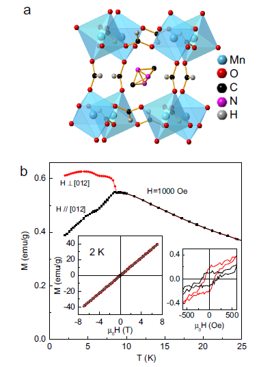 | 图1. [(CH3)2NH2]Mn(HCOO)3金属-有机骨架材料的晶体结构和磁性。 |