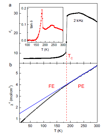 | 图2. 介电常数和磁化率倒数随温度的变化。在铁电相变处,磁化率出现反常。 |