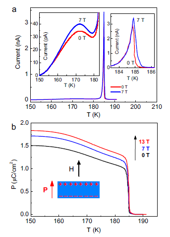 | 图4. 不同外加磁场下的热释电和铁电极化强度。在外加磁场下,铁电极化增强。 |