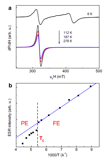 | 图3. 电子自旋共振谱随温度的变化。在铁电相变处,磁共振强度出现反常。 |