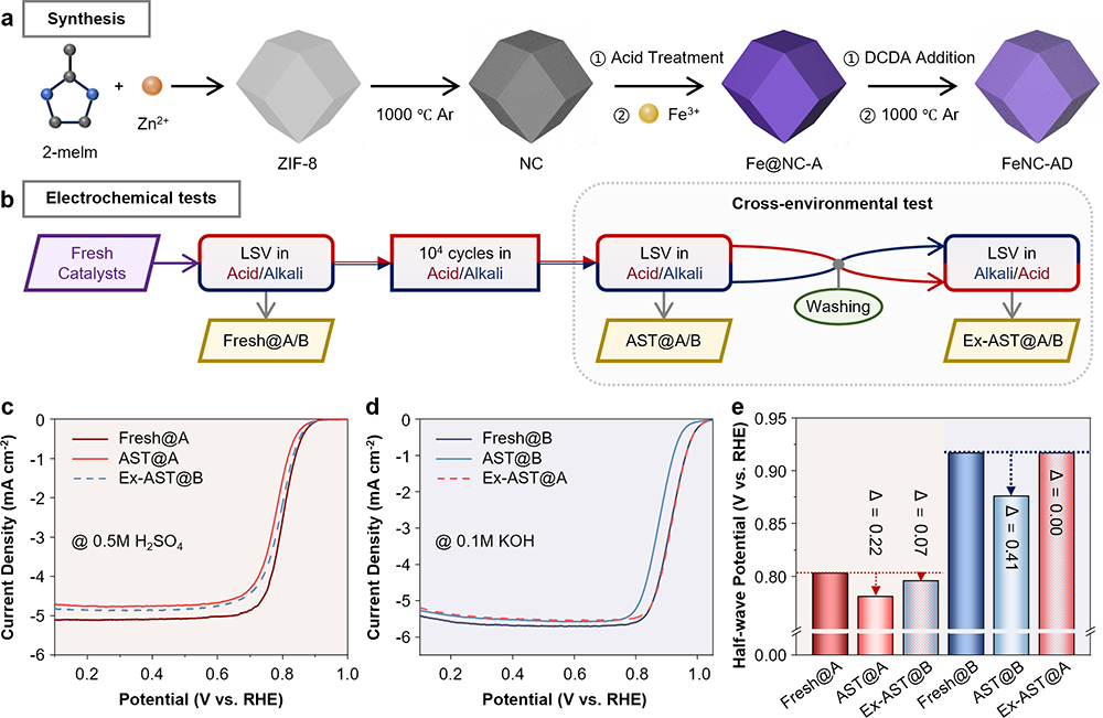 燃料电池作为一种高效、清洁的电化学能源转换技术,可将燃料的化学能直接转化为电能,具有能量转化效率高、环境污染小等优点,是未来能源体系的重要组成部分。然而,其商业化应用受到阴极氧还原反应(ORR)动力学的严重制约。目前广泛使用的铂基催化剂成本高昂、资源稀缺,开发低成本、高性能的非贵金属替代材料成为当前研究的热点。近年来,铁-氮-碳(FeNC)单原子催化剂因其高活性和原子级分散的特性受到广泛关注,展现出替代铂基催化剂的潜力。然而,该类催化剂在实际应用环境中稳定性不足,特别是在不同pH条件下表现出显著的性能差异,其背后的机理尚不明确,严重制约了其实际应用。
