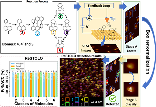 图1. 研究体系、ReSTOLO的两阶段分子图像识别过程及优异的识别性能。YOLO v5.m和ResNet-101分别专注于定位、分类任务,并通过框归一化相互连接,极大减少了检测框的易变性带来的干扰,取得了理想的检测效果。图片来源:J. Am. Chem. Soc.