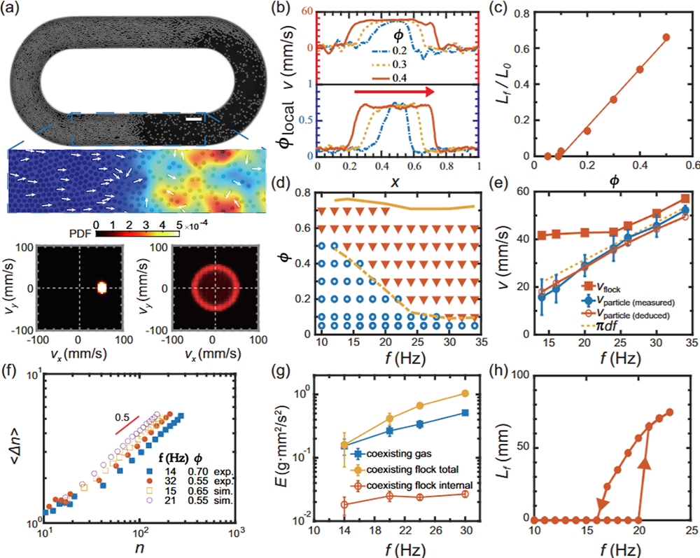 图. 群集相分离现象。a. 顶部:实验系统俯视图,比例尺:5 毫米。中部:跑道直段内的放大图,颜色代表等效温度,箭头指示局部速度。底部:集群内速度(v)的概率分布(左)和气相中的概率分布(右);b.粒子速度和面积分数的空间分布;c. 约化群集相长度()随的变化关系,符合杠杆定律;d. 群集相分离关于密度和频率的相图。空心圆表示各向同性状态,实心三角形表示群集相分离;e. 群集传播速度(方形)和群体内粒子速度(圆形)。空心圆表示根据 Rankine-Hugoniot 跃变条件推断的速度;f. 群集相内部粒子数涨落;g. 群集相与共存气相中每个粒子的能量。空心符号表示密集集群相内每个粒子的内部动能,对应于等效温度;h. 测量到的群集相长度的滞回线。