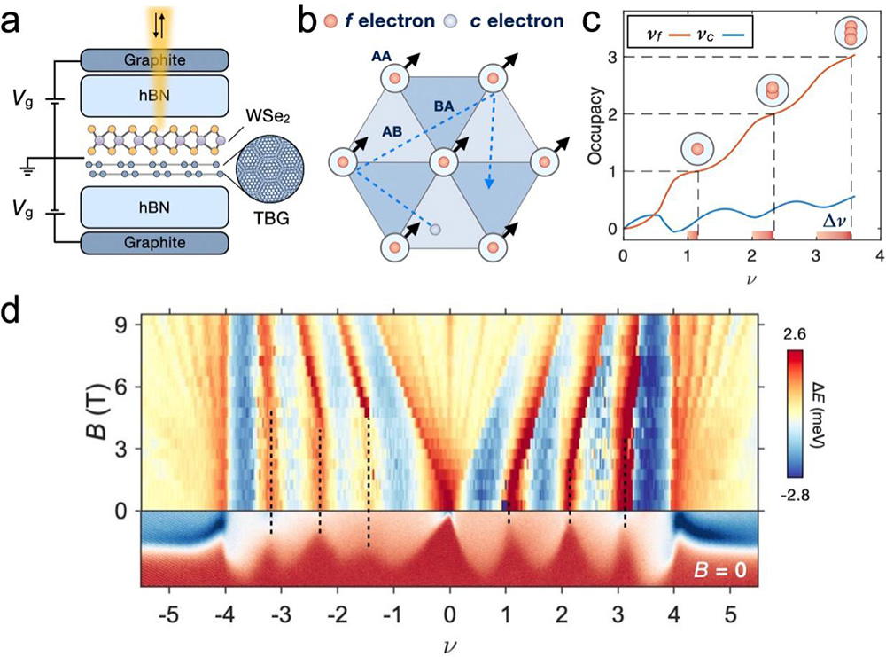 其中 Bc 为关联陈绝缘体态出现的临界磁场,Φ0 为磁通量子,C 为陈数。他们与香港科技大学的戴希研究组合作,通过发展Gutzwiller方法进行计算,指出该实验发现可以通过魔角石墨烯的拓扑重米子模型(图1b)来解释。其中,相对整数填充的偏移行为起源于转角石墨烯中AA堆垛区域局域 f 轨道的整数填充,带来了电子态密度重整化出的极小值。该理论并不需要任何对称性破缺态的存在来解释“级联现象”。这一工作为魔角石墨烯中广受关注的拓扑重费米理论模型提供了实验证据,加深了对于这一体系的理解和认识。