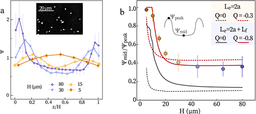 图1 受限空间减弱表面富集现象。a)细菌在不同厚度H样品中的密度分布。B)样品中央区域密度和密度峰值的比值。曲线代表不同的力四极子强度和细菌长度下模型的预测值。