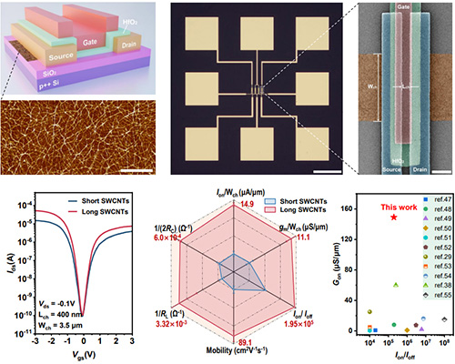 最近,该团队开发了一种结合重复短时超声分散与凝胶色谱迭代分离的新型技术,实现了少缺陷、超纯长半导体碳纳米管的宏量分离。所得的半导体碳纳米管纯度超过99.9999%,为目前水相分离技术报道的最高半导体纯度。分离出的半导体碳纳米管平均长度超过430 nm,其中约47%碳纳米管长度超过400 nm,这是传统分散和分离方法制备的半导体碳纳米管长度的两倍多。利用这些半导体碳纳米管制备的网络薄膜晶体管展现出了卓越的电学输运性能,其开态电导率和载流子迁移率分别达到了149 µS/µm 和89.1 cm2V-1s-1,同时还保持了超过105的开关比。这些性能指标远高于已报道的碳纳米管网络薄膜晶体管。该研究成果为开发大规模、高性能碳纳米管器件提供了高质量的材料基础。