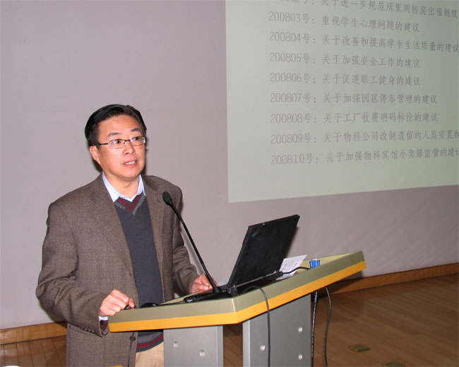 孙牧书记传达了刚刚闭幕的中国科学院2010年度工作会议精神,重点介绍了路甬祥院长讲话的精神和白春礼常务副院长的工作报告的主要内容,使广大职工、研究生及时领会到院党组对今后发展的指示和要求。此外,孙牧书记对物理所2008年度职工大会提案进行了答复。