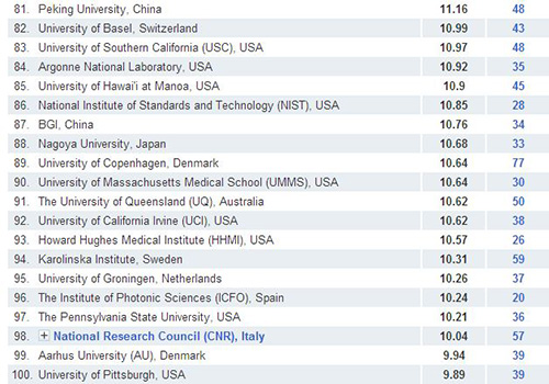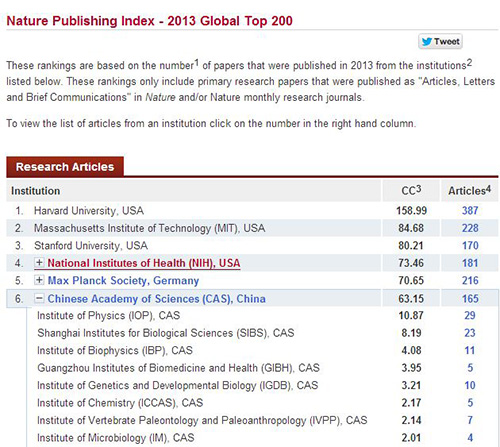 国际权威学术期刊《自然》杂志3月27日发布的年度报告显示, 中科院2013年在《自然》杂志上发表高质量论文的出版指数达到63.15,由上一年的世界第14位跃升至第6位,并超过日本东京大学,排名亚太地区科研机构首位。