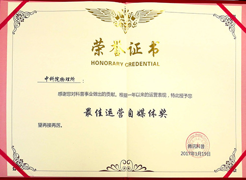 1月19日,“腾讯科普”举办2016年度“科普类自媒体大会”,结合科普类公众号的文章阅读量等推送数据,对表现优秀的自媒体进行了表彰。中科院物理所微信公众号荣获2016年度最佳运营自媒体奖。