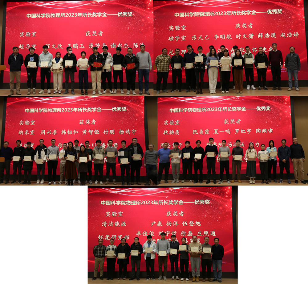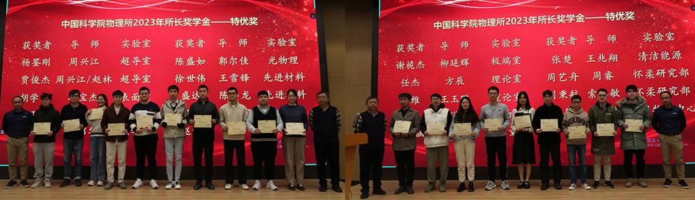 顾长志首先对本年度实验室获奖的全体同学表示祝贺,并对参会评委们表示衷心的感谢。在致辞中他表示,同学们通过过去几年的努力和积累,在科研等方面取得了一定的成绩。同时,他也希望同学们将本次荣誉作为新的起点,未来继续做好科研工作。会议恰逢冬至,他表示新的一年即将到来,同学们要利用好考核活动的机会,与老师、同学们多多开展交流,为今后取得更好成绩做准备。最后,他期盼物理所所有同学未来继续保持严要求、高标准的势头,做好自己工作的同时也能够带动身边同学积极进取、共同进步。随后举行了2023年度所长奖学金优秀奖颁奖典礼,教育督导及导师代表为获得所长奖学金优秀奖的55名学生颁发了获奖证书,并合影留念。