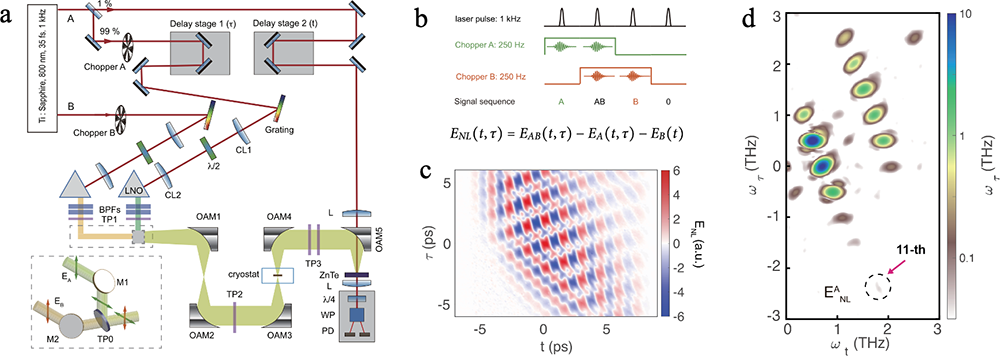 图1. (a) 二维太赫兹相干光谱的光路示意图。(b) 二维光谱的测量时序与调制原理。(c-d)硅单晶在室温下的二维时域和频域非线性信号。