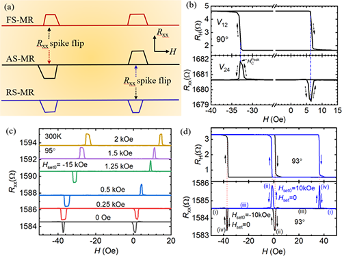 图:磁场对称性调控磁阻效应原理示意图及实验观测结果 (a)磁场对称性调控磁阻效应原理示意图;(b) 反常霍尔效应诱导的非对称磁电阻AS-MR效应;(c)可调预设磁场通过磁场对称性实现非对称磁电阻AS-MR、正向对称磁阻FS-MR与反向对称磁阻RS-MR间可逆转变;(d)正向对称磁阻FS-MR与反向对称磁阻RS-MR间可逆转变。