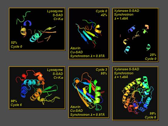 图中自左至右三个蛋白质Lysozyme, Azurin和Xylanase,用第一版的OASIS (2000)联合DM, RESOLVE, ARP/wARP等程序求解,所得结果示于图的上半部;如改用OASIS-2004联合DM, RESOLVE, ARP/wARP等程序进行“双空间SAD相位迭代推演”,由此自动构建的三个结构模型(示于图的下半部)其完整度都有成倍的提高。