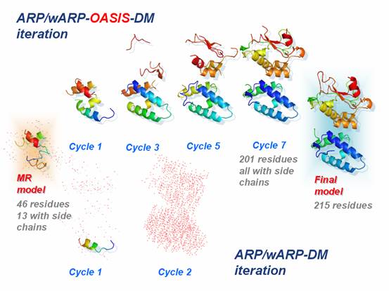 图中所示为蛋白质复合物E7_C–Im7_C的MR模型迭代过程。左边是由分子置换(MR)法求得的部分结构模型;右边是经过精修之后的“最终”模型。从MR模型出发用ARP/wARP-DM迭代,所得结构模型逐轮退化如图底部所示。及至第三轮还出现运行错误。但是,在ARP/wARP和DM之间加入OASIS-2006,则可以自动构建出相当于整体结构90%以上的结构模型,如图顶部所示。