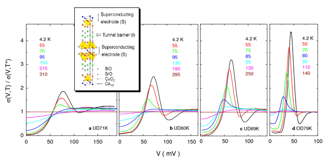 | 图一、不同掺杂的Bi2Sr2CaCu2O8+δ超导体的本征电子隧道谱,插图为晶体内部隧道结的形成情况。 |