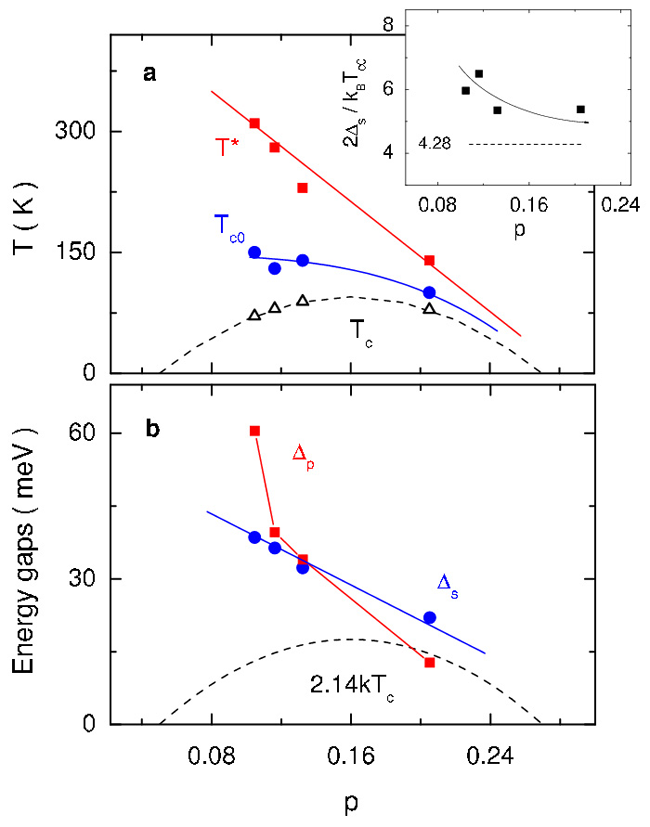 | 图二、超导和赝隙态的(a)特征温度和(b)能隙随掺杂的变化,插图为2Δs/kTc0值。 |