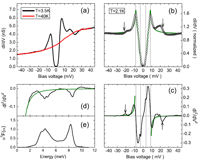 | 图-1:(a) 在很低温度(黑色曲线)和超导转变温度Tc以上(红色曲线)测量到的典型隧道谱。 (b) 在16.7 nm × 8.4 nm区域的阵列上逐点测量到的所有隧道谱的平均(已经过归一化处理)。两个超导能隙所对应的能量位置用两对灰色竖直线条表示。黑色的箭头指示了鼓包-低谷(hump-dip)特征(对应一个mode),绿色曲线是用两能隙的弱耦合BCS理论拟合的结果。 (c) 根据(b)中的数据计算得到的隧道电流的二阶倒数。绿色线条是BCS理论曲线。 (d) 黑色曲线是一个传统强耦合超导体Pb的d2I/dV2~ (eV-Δ) 关系。绿色线条是BCS理论曲线。 (e) 与(d)相对应的Pb的电声子谱函数。 相关链接:http://link.aps.org/doi/10.1103/PhysRevLett.108.227002 |