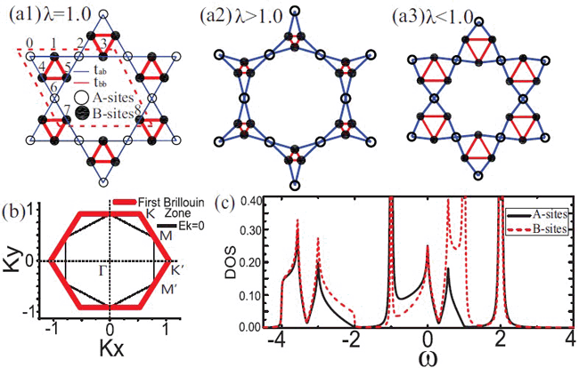 | 图1 三角 kagome 格子示意图。 (a)具有不同非均匀性因子λ的三角 kagome 格子示意图,λ=1 时系统是均匀的。 (b)三角kagome在 λ=1, U=0 情况下的第一布里渊区与费米面。 (c)三角 kagome 在λ=1, U=0 情况下的态密度。 |