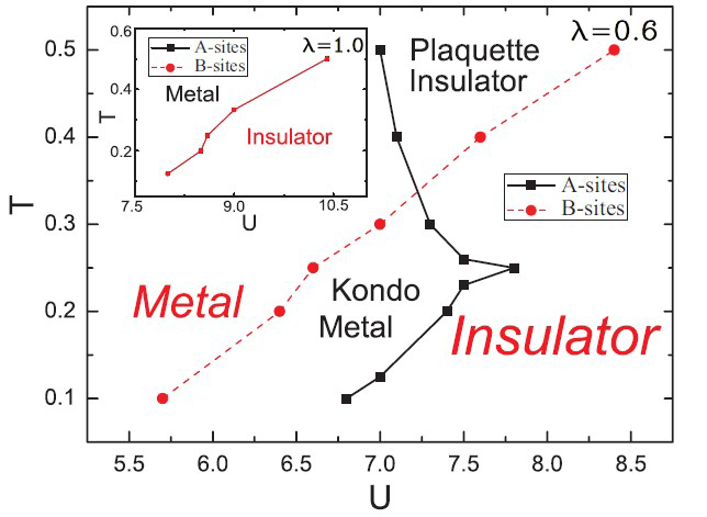 | 图2 当λ=0.6 时,三角 kagome 格子的相图。非均匀性λ使得三角 kagome 格子的相变线发生变化。A 子格和B 子格的相变点发生分离,形成两种新的相:片绝缘体(Plaquette Insulator)和Kondo金属(Kondo Metal)。 |