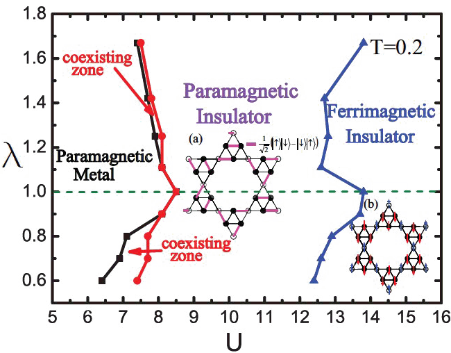 | 图3 三角 kagome 格子随相互作用 U 和非均匀性因子 λ 变化的相图。插入图(a):顺磁绝缘体中可能存在的共价键分布示意图。 插入图(b):亚铁磁绝缘体的自旋分布示意图。 |