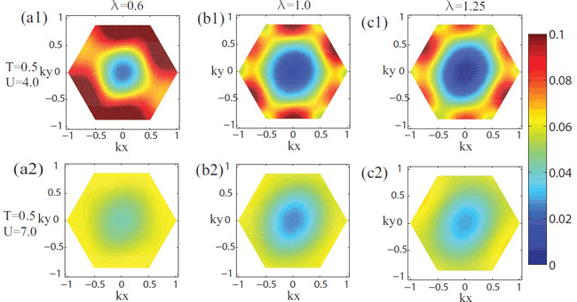 | 图4 三角 kagome 格子中费米面上谱函数随相互作用 U 和非均匀性因子 λ 变化。(a)λ =0.6,(b)λ =1.0,(c)λ =1.25。 |