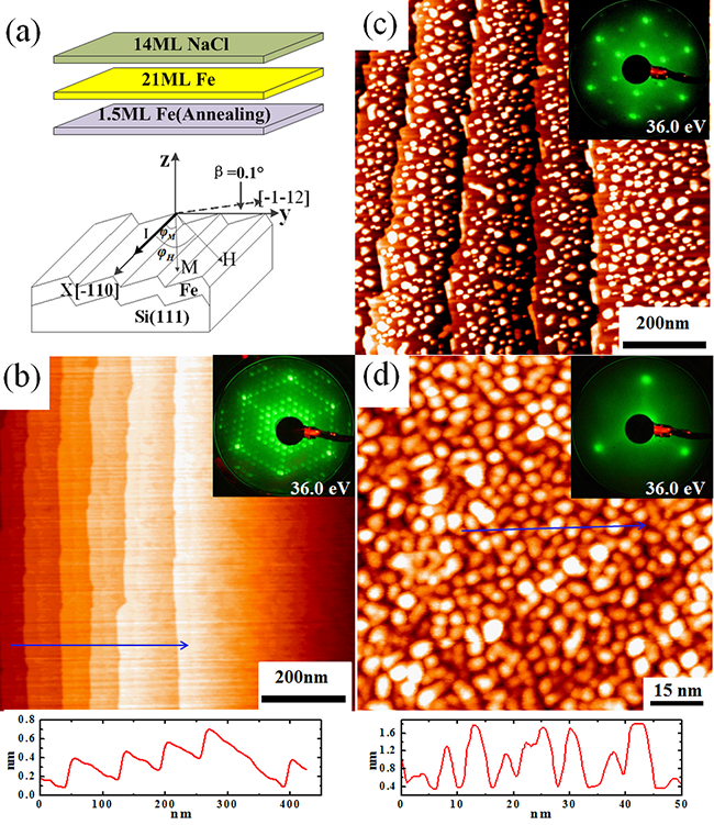 | 图1 Fe/Si(111)样品制备和测量过程示意(a),样品表面形貌和结构分析(b-d) |