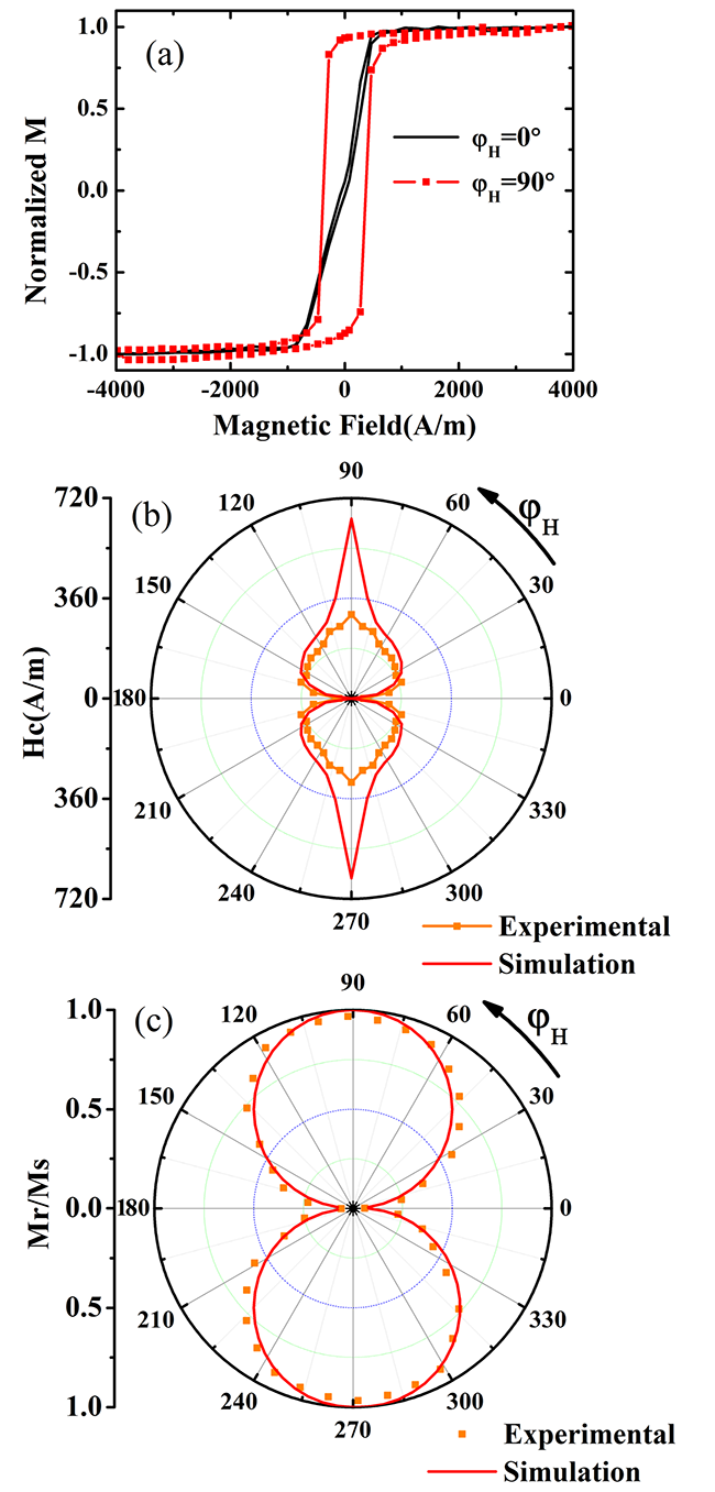 | 图3 磁性测量结果.(a)易轴和难轴的磁滞回线;不同方向的矫顽力(b) 和剩磁(c) |