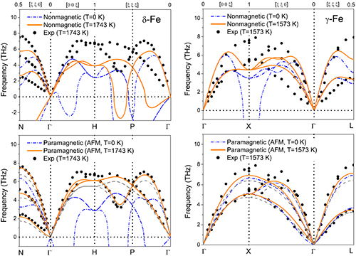 单质铁的结构与磁性在高温下会发生显著的变化。低温相α铁具有体心立方晶格,在居里温度1043 K以下表现为铁磁性;随温度上升存在两种顺磁态下的结构相变,即在1185 K转变为面心立方γ相和在1667 K转变为体心立方δ相。尽管α相的基态行为可以由铁磁Stoner理论来描述,其在高温下转变到γ和δ相的物理机制还没有得到广泛认可的解释。早期的理论研究由于只单独考虑磁自由度或振动自由度,在铁的高温相变是磁熵还是振动熵占主导这一问题上存在很多争论。近年来实验上对铁在不同相变点附近声子谱的非弹性中子散射研究表明:α-γ相变是由同等的振动熵和磁熵的增加导致,而γ-δ变主要源于振动熵的增加。这些实验进展阐明了高温γ和δ相的热力学稳定机制,但其背后的物理作用机制仍有待深入研究。在准简谐近似下,人们利用动力学平均场理论等方法,通过引入有限温度的磁相互作用较好解释了铁在α-γ相变点的声子色散行为,但在γ-δ相变点得到的结果与实验偏离很大。
