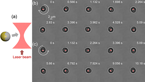 | 图2. Janus粒子在光阱中的顺时针和逆时针旋转运动的光学显微镜图像。 |