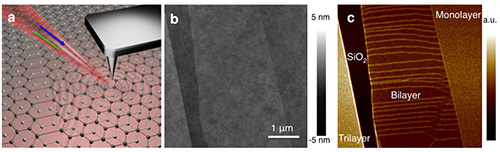 | 图1. 利用近场红外纳米成像技术对双层石墨烯中的畴壁进行成像。(a)近场红外纳米成像技术示意图;(b)双层石墨烯AFM高度图;(c)相应的近场光学图像。 |