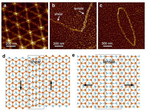 | 图2. (a)-(c)双层石墨烯中丰富多彩的畴壁结构;(d)-(e)两种极限畴壁shear和tensile的微观结构示意图。 |