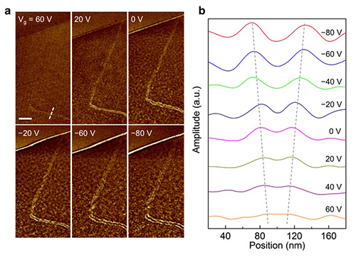 | 图3. (a)栅极电压对shear和tensile两种畴壁处等离激元反射行为的调制作用;(b)不同栅极电压下沿着图(a)白色虚线处的轮廓线。 |