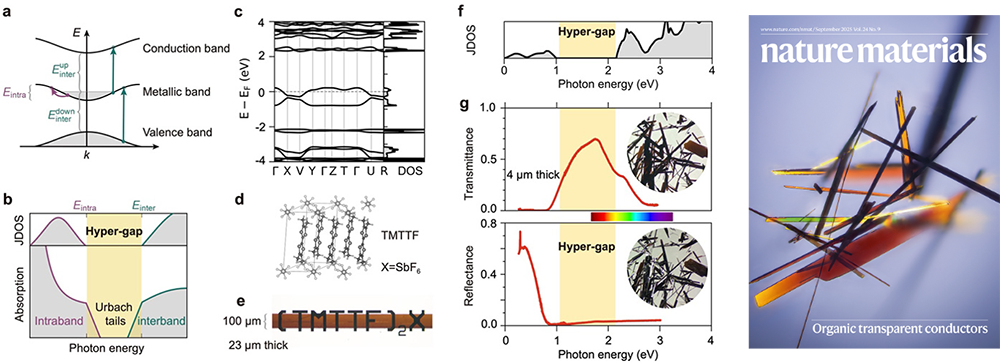 a, 超带隙导体的电子结构示意图; b, 对应的联合态密度(JDOS)及光学吸收; c, (TMTTF)2SbF6的电子结构;d, 晶体结构;e, 样品在透射光下的显微照片, 晶体置于不透光的文字之上;f, 晶体的JDOS;g, 晶体的透射谱(上)与反射谱(下),以及相应的晶体照片(插图);h, 杂志封面。