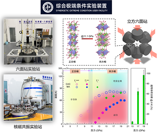 综合极端条件实验装置的六面砧高压实验站和强磁场核磁共振实验站的实物照片,以及La2PrNi2O7多晶样品的高压结构演化和超导相图。(中国科学院物理研究所供图)