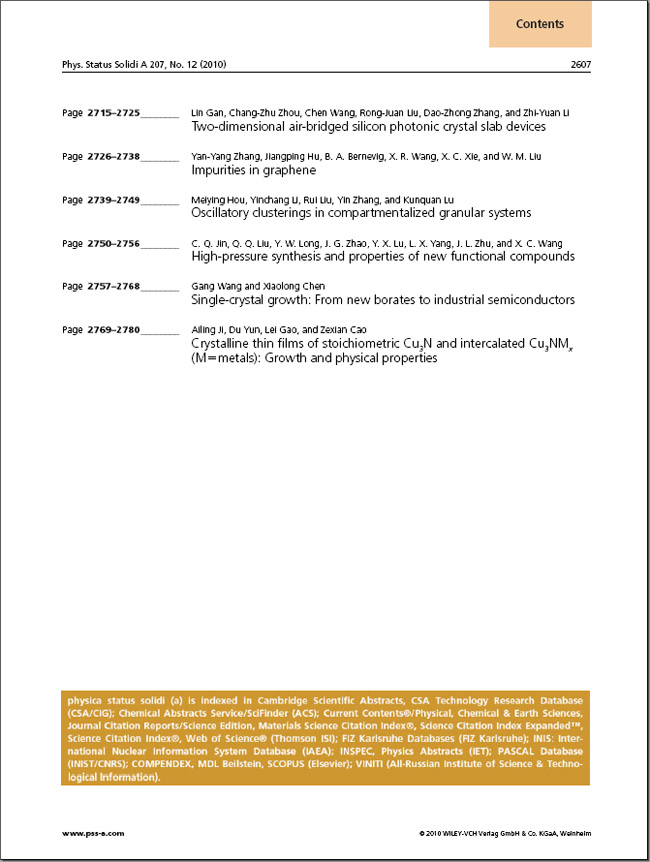 以下为Physica Status Solidi A 2010物理所专刊的详细内容:http://onlinelibrary.wiley.com/doi/10.1002/pssa.v207.12/issuetoc