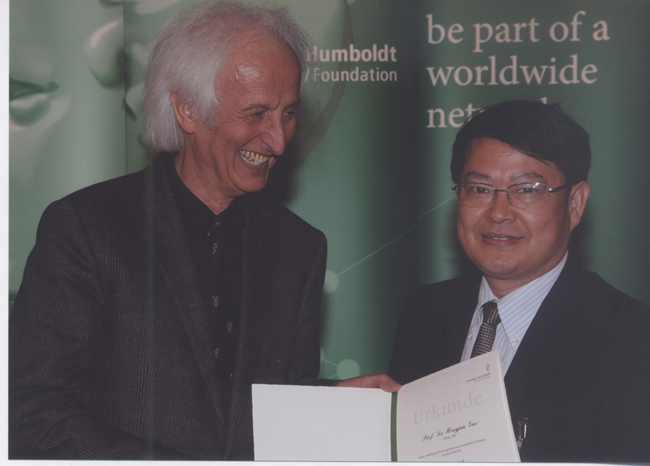 近期,德国洪堡基金会在德国Bamberg举行颁奖大会,正式授予物理所高鸿钧研究员洪堡研究奖(Humboldt Research Award),以表彰他在低维量子体系的构造与物性以及扫描隧道显微学领域的突出贡献。洪堡基金会主席Helmut Scharz教授在会上宣读了获奖证书: “Professor Gao is a world leading authority in the investigation of single molecule transport properties at solid surfaces. He and his group have pioneered ideas of potential use of single molecule conductivity in information storage.”