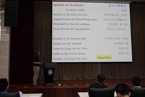 报告中,曹则贤研究员还对“惯性”这个词,赋予了自己的一番讲解“它的英文是Inertia,其实它也翻译得不对,应该翻译成它本来的意思‘惰性’才更贴切。”同学们忍不住纷纷点头称赞。讲到Special Relativity,他一语双关——“正则则贤”,同学们顿时心领神会。