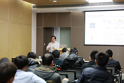 刘宝利副研究员先讲解了光学极化的矩阵表示及实验操作方法,然后介绍了超快磁光光谱测量的基本原理,随后讲解了他研究组设计和搭建的高灵敏度超快磁光激光光谱测量系统(包括时间分辨克尔/法拉第旋转和瞬态自旋光栅两套测量系统),并基于该系统开展的半导体低维材料中自旋动力学、输运过程的研究。李运良特聘研究员首先介绍了二维超快红外光谱技术的基本原理与必要性,及他本人在该技术上进行研发的思路,随后讲解了他研究组利用最前沿的时间分辨性的二维非线性光谱和超快成像技术研究不同体系中有关能量传输,电子耦合,结构变化方面取得的一系列进展。