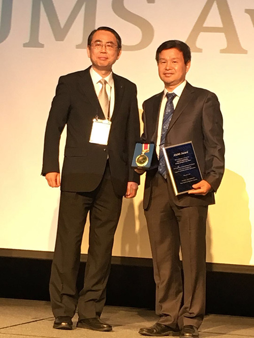 2018年度“亚洲磁学联盟奖”(AUMS Award)于6月4日在韩国揭晓。颁奖仪式在韩国济州岛举行,物理所韩秀峰研究员以“基于磁性绝缘体的磁子阀效应”项目荣获此奖。亚洲磁学学会会长日本东北大学高梨弘毅(Koki Takanashi)教授为其颁发证书。