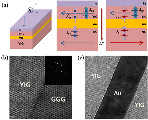 随后,韩秀峰研究团队创新性地采用YIG磁性绝缘体作为磁性电极、Au作为中间层研制出了高质量、新型磁性绝缘体/金属/磁性绝缘体(MI/NM/MI)磁子阀结构,并且在该结构中首次观测和发现了磁子阀效应(Magnon Valve Effect),揭示了磁子阀比值主要取决于磁性绝缘体/金属界面磁子-电子自旋转换效率的原理。